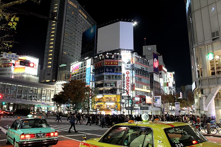 ↑[Unknown sourceUnknown source, Public domain, via Wikimedia Commons] 1952年(昭和27年)の渋谷交差点。人も車も少ない。左下隅にはベンチに囲まれたハチ公の像が見える。
