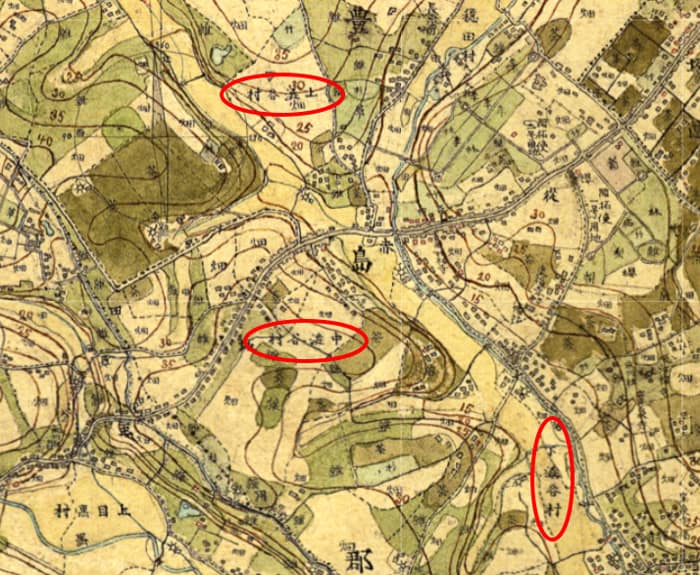 「上渋谷村」「中渋谷村」「下渋谷村」を赤い楕円形で囲みました。これを見ると茶畑が多い。畑もあり、竹とか杉、梨、梅、桜もある。田は少ない。