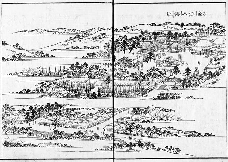 ↑江戸名所図絵に描かれた「金王八幡社」。渋谷駅から徒歩10分の距離という。ということは、渋谷駅周辺は江戸時代こんな風景だった。