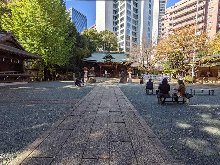 金王八幡宮(こんのうはちまんぐう)の現在の姿。高層ビルに囲まれ、規模は小さくなっていても健在です。