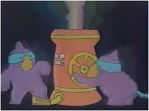 渋谷川(穏田川)の水流を利用して水車を使って田に水を引いている。女性はその水で洗い物をし、子供は亀で遊ぶ。水車で粉ひきをするために男性が穀物を運んでいる。